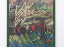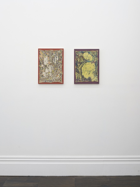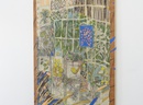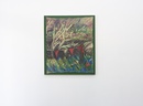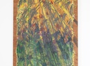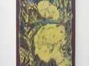 Unlike paintings on stretched canvas, Arnold’s canvas works seem to withdraw from their frames back into drawings. Their edges are raw and exposed, wavy borders of trapped tension that are tacked to the board beneath.