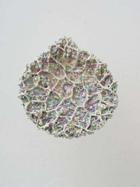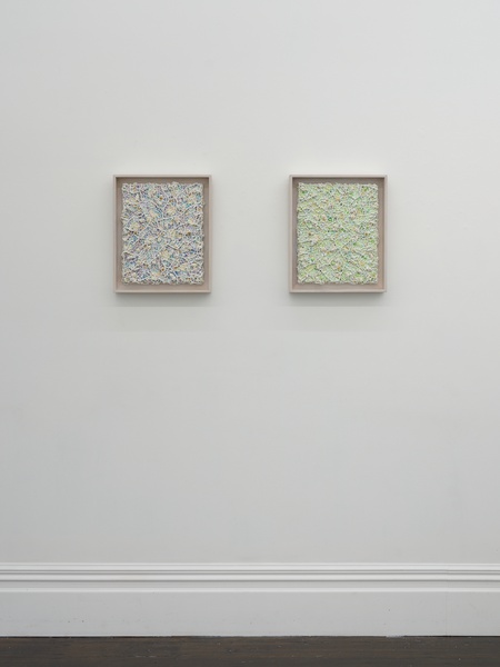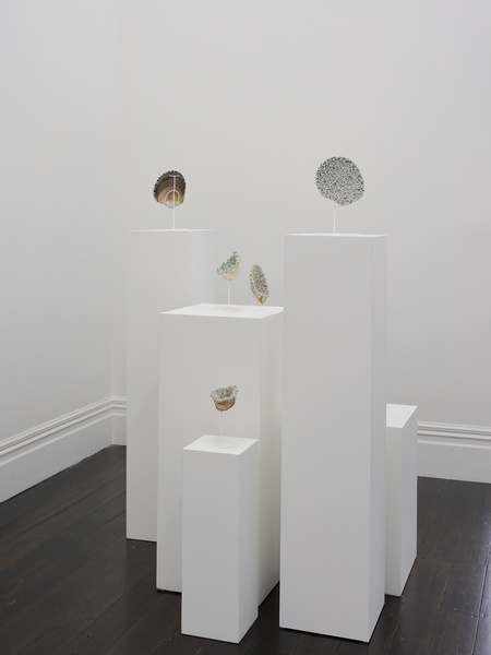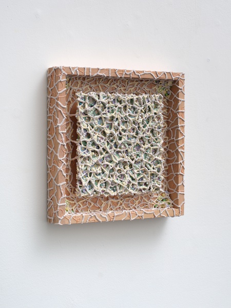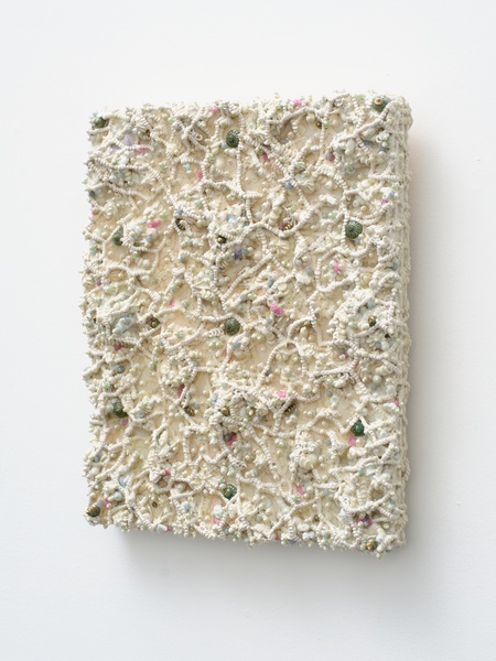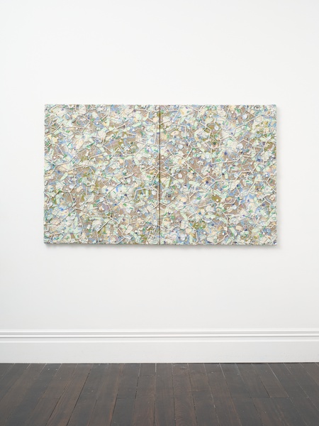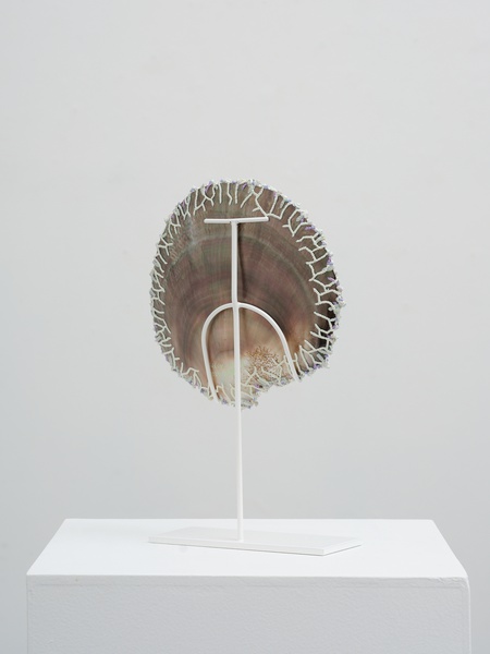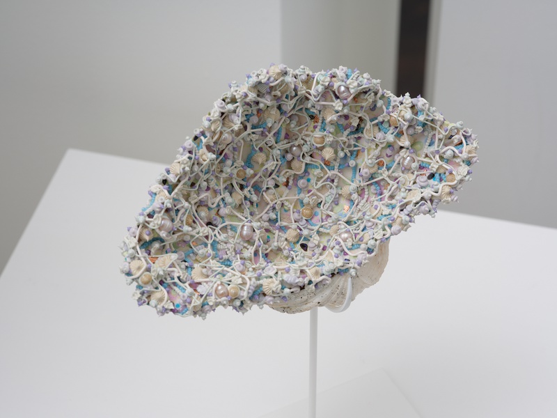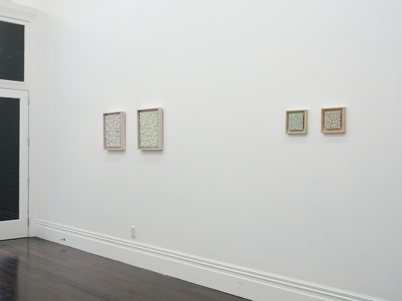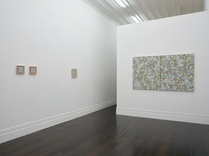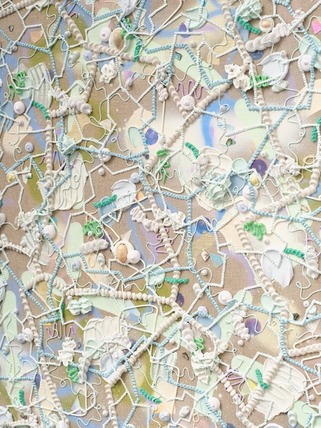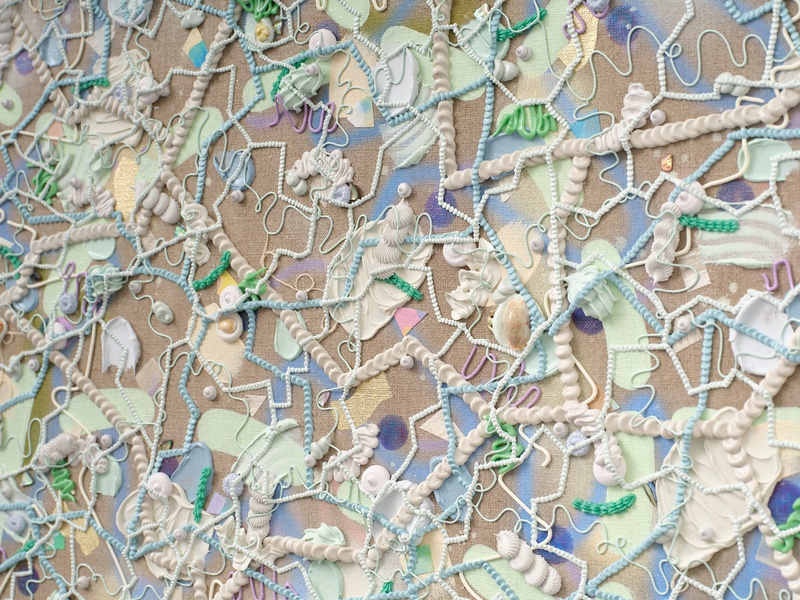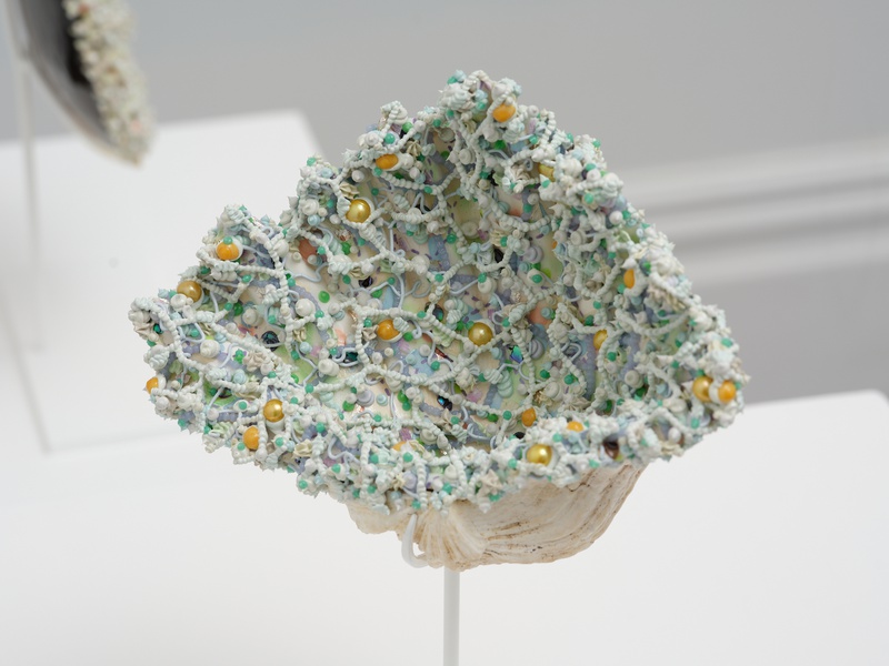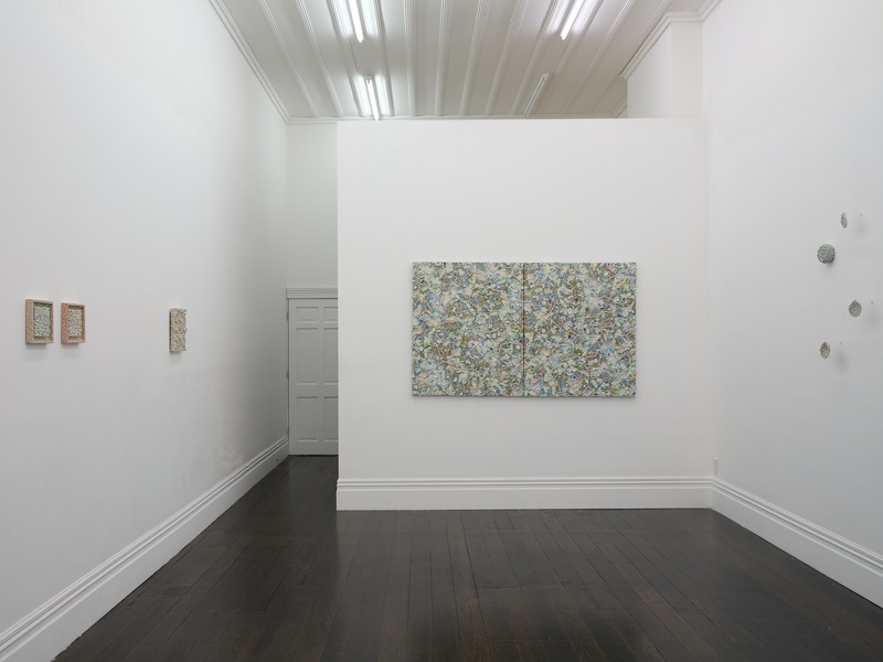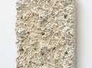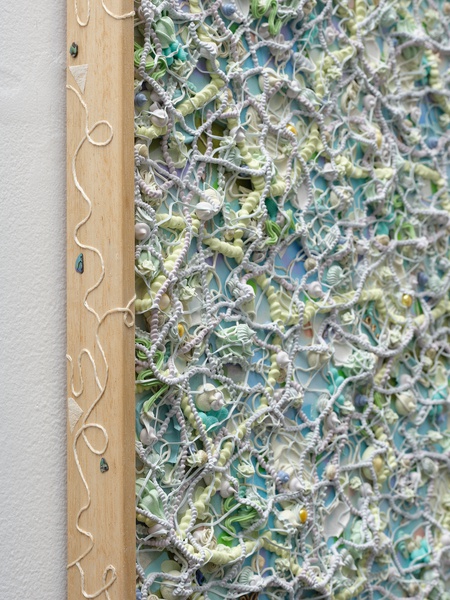 Jowitt’s practice is also steeped in the histories and language of abstraction, drawing on a lineage of artists who have pushed paint beyond the frame—into sculptural space and the realms of process, gesture, and expression. Yet her work also charts its own course, carrying with it motifs and materials that bring together these two quite different currents in her work: shell, coral, masi, and seaweed are inlaid into surfaces thick with paint, resin and other mediums creating a vista of delicate, yet intensely detailed reliefs.