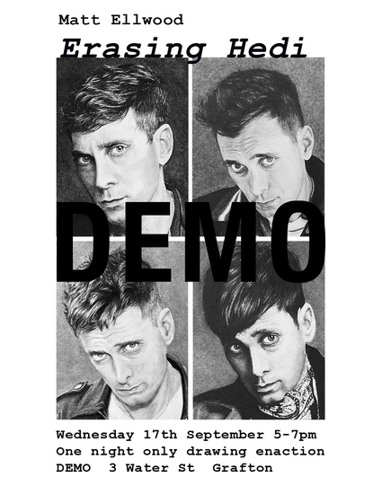 This time, he has drawn four portraits of the fashion designer himself, Hedi Slimane, taken from licensable stock images online. Matt now invites you, as the audience, to contribute to these artworks by standing on an ‘Erasure Apparatus Prototype’, wielding a much-larger-than-normal eraser, and rubbing out his charcoal pencil drawing as and how you like within a 30 second timeframe per person.