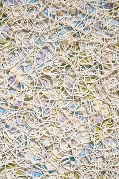 The result is painting as sculpture, faded rainbow-coloured elements assert themselves, thrusting themselves forth from their substrates. Shade and shadow are present, as is actual depth, a self-conscious play between projection and recession, layers and ground. An intricate filigree is formed in delicate and bewildering webs of paint.