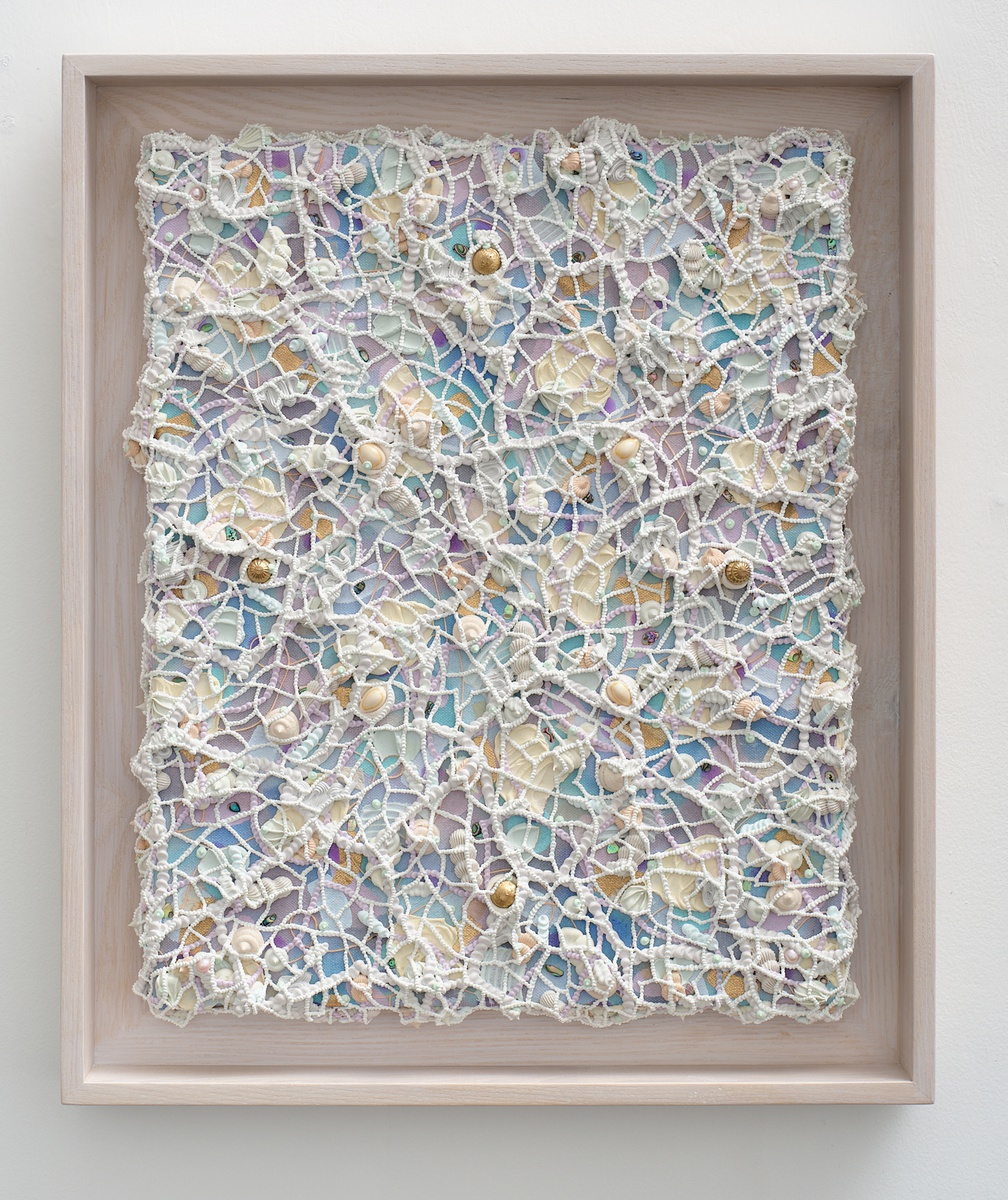 acrylic with Fijian vau & masi, thread, bronze powder, clay forms, pāua shell, ringed topped buli (cowrie) shells & cultured pearls on framed canvas
